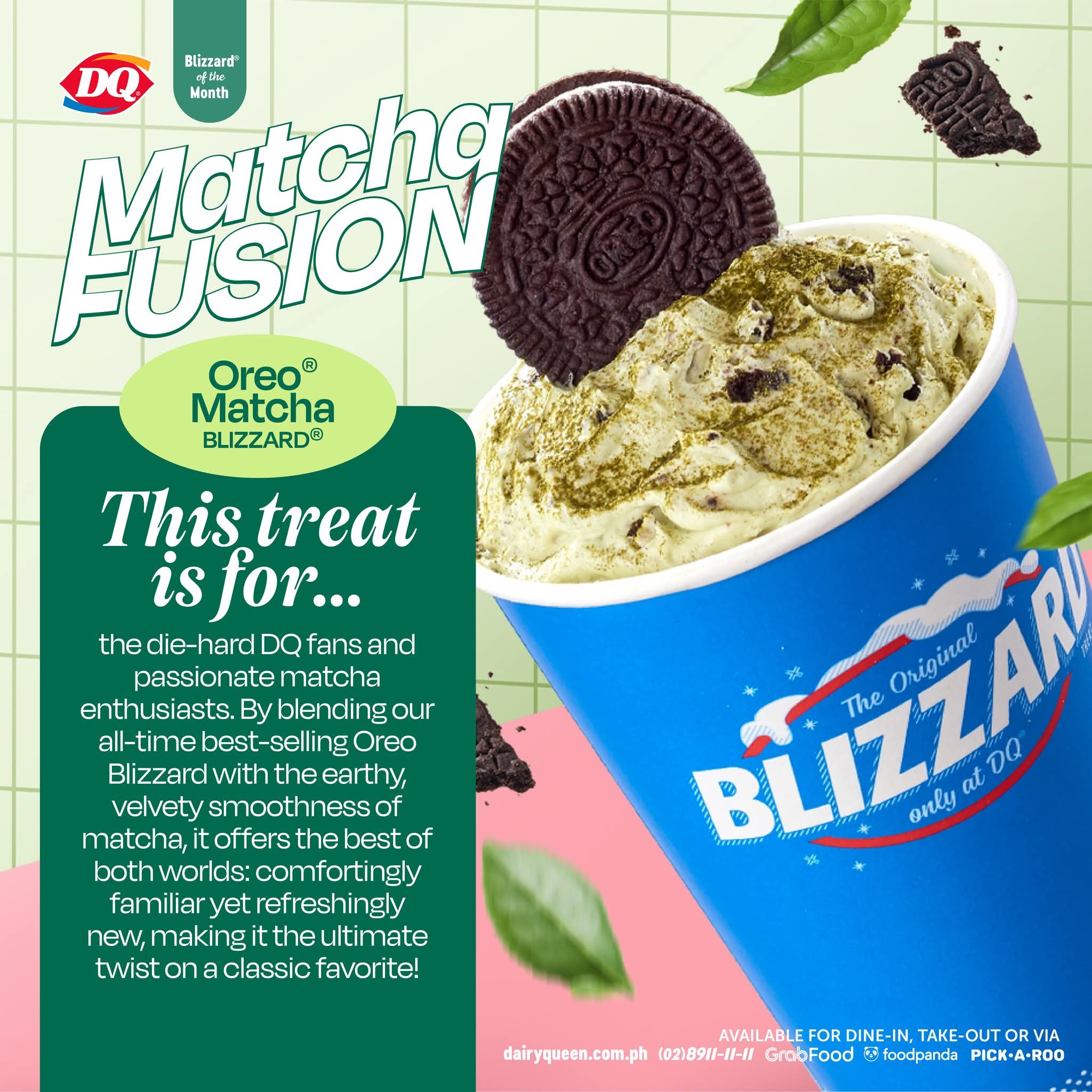 Rounding off the new limited-edition Blizzard flavors is the Oreo Matcha Blizzard, made with DQ’s signature vanilla soft serve mixed with matcha syrup and Oreo cookie bits, and then topped with matcha powder and one whole Oreo cookie! It’s DQ’s best-selling Oreo Blizzard made more mouthwatering with matcha, adding a delightful twist on a classic favorite and making it the perfect treat for DQ fans and matcha lovers alike!
